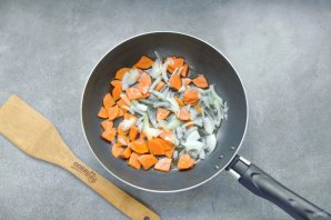 Морковь и лук нарежьте произвольно и выложите в сковороду. Налейте подсолнечное масло и пассеруйте овощи 7-8 минут.