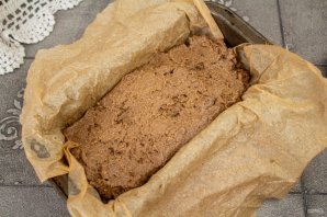 Выстелите форму пергаментом и выложите тесто, разровняйте его.