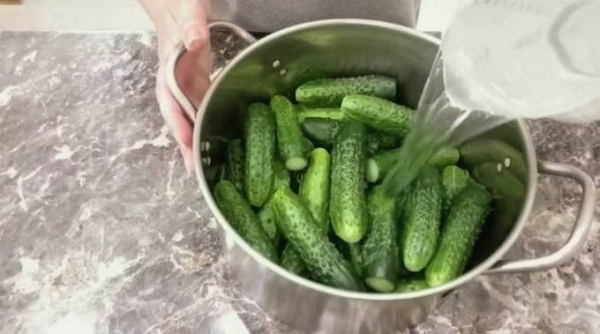 В другой кастрюле закипятить литр чистой воды, остудить до 70 градусов и растворить в ней ложку каменной соли. Горячим рассолом залить огурцы.