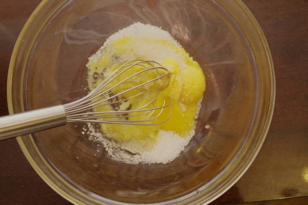Шаг 1. В миску разбейте яйца, всыпьте туда же сахар и немного соли. Взбивайте яйца с сахаром и солью, пока весь сахар не растворится, а масса должна побелеть. Работайте миксером, блендером или ручным венчиком.
