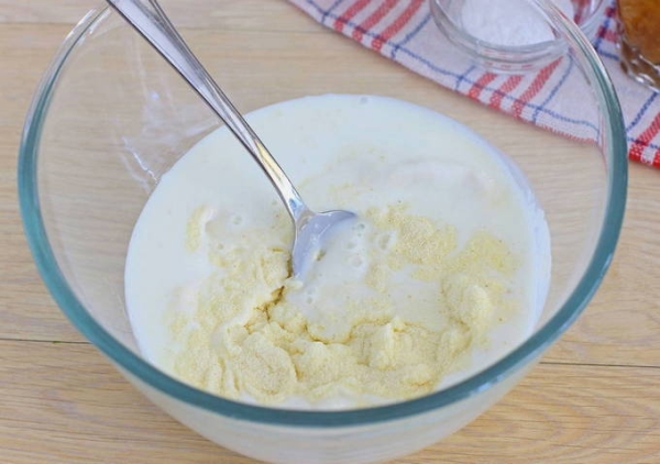 Шаг 1. Как и в приготовлении любого другого манника, начинать нужно с того, чтобы смешать манку с кефиром и оставить эту смесь на столе минимум на 30 минут, но можно и подольше.