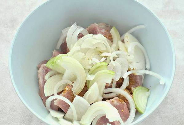 Шаг 2. Свинину нарежьте средними по размеру кусочками для шашлыка. Выложите слой мяса в миску на лук, посолите и приправьте. Так укладывайте слоями лук и свинину, пока они не закончатся.