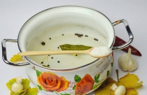 Кипятим воду с солью, сахаром и специями. Опускаем сюда подготовленные шампиньоны.