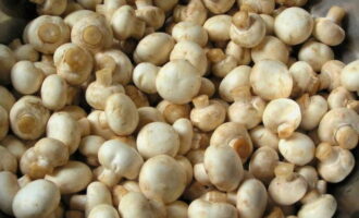 Шаг 1. Заготовим маринованные шампиньоны на зиму с горчицей. Сперва очищаем и промываем грибы.