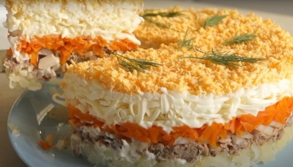 Мимоза — это исконно советский салат, который стал актуален для общества примерно в 1970 годы. Салат готовится из нескольких слоев, по внешнему виду, а точнее цветовой гамме, слегка напоминает цветок Мимозы. Собственно, благодаря серебристой акации салат и получил ее название, употребляемое в простонародии.