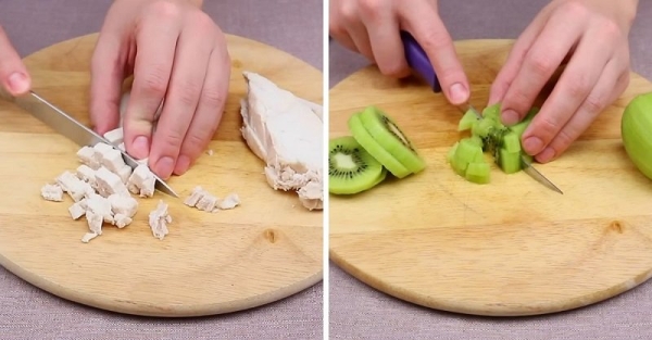 Сегодня редакция «Со Вкусом» предлагает вам приготовить салат, в состав которого входят очень разные по характеристикам и ароматным свойствам ингредиенты. На первый взгляд кажется, что эти продукты совершенно несочетаемы. Однако это не так: подобная комбинация не оставляет равнодушным никого. Многослойный салат с киви и курицей получается очень ярким, легким и достаточно сочным.
