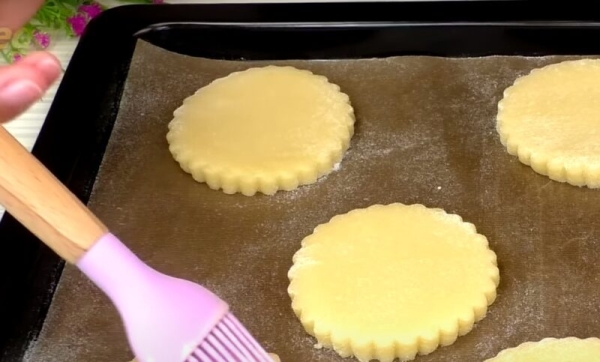 Перекладываем коржики на противень, застеленный пергаментом. Смазываем верхушки теста смесью желтка и молока, создаем узор вилкой на поверхности.
