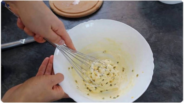 Венчиком или ложкой эти ингредиенты хорошо перемешать до однородной консистенции. Замешанное тесто должно получиться жидким.