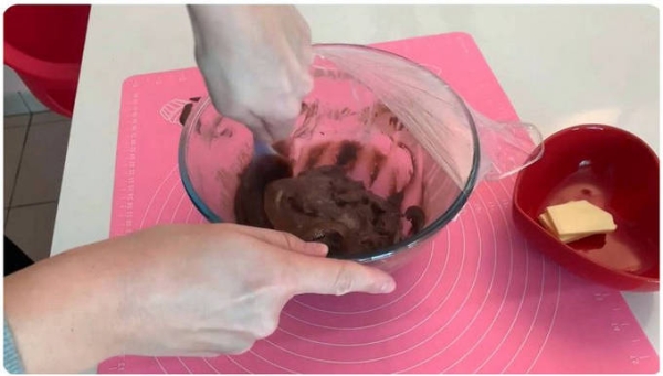 Шаг 3. Затем посуду извлечь из микроволновки, тесто хорошо перемешать, закрыть пленкой и поставить в микроволновку еще на 50 секунд. Тесто должно получится эластичным, плотным и подобным пластилину, поэтому процесс заваривания можно еще раз повторить.