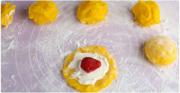 Шаг 4. На каждую лепешку положить по одной клубнике, завернуть и скрепить края теста, чтобы получились круглые моти. Хорошо обвалять их в крахмале.