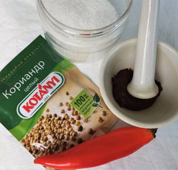 Шаг 4. Перетираем кориандр с солью в ступке. Приправляем специями, солим и солодим. Хорошо размешав и прикрыв, оставляем до утра в прохладе. Спустя время собираем жидкость образовавшуюся сверху.