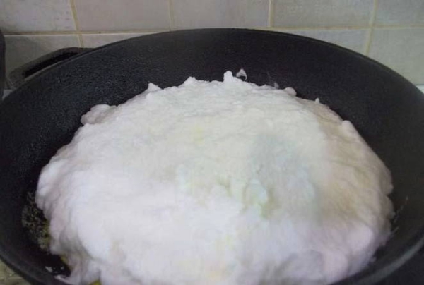 Массу переливаем на холодную сковородку и готовим 5 минут под крышкой на огне, ниже среднего.