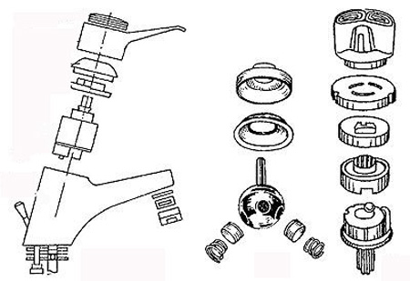 устройство картриджа в смесителе. Существует 2 их разновидности: шаровой и керамический картридж.