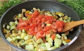 Теперь в сковородку перекладываем помидоры, перемешиваем и закрываем крышкой. Томим на минимальном нагреве 20-25 минут, солим и перчим за 10 минут до готовности.