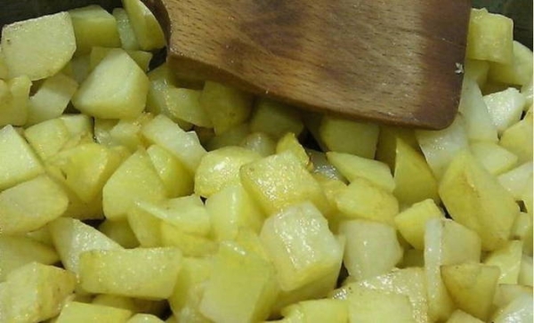 Шаг 3. Картофель нарезать небольшими кубиками, капусту нашинковать соломкой и переложить их к обжаренным овощам.
