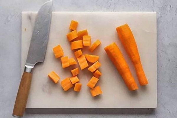 Шаг 6. Морковь очистить, промыть и так же нарезать небольшими кубиками.