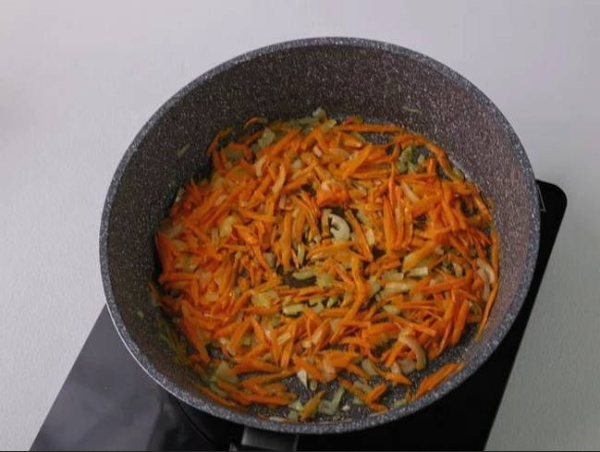 Шаг 5. В сковороде разогреть две ложки расти тельного масла, обжарить на нем до румяного цвета нарезку лука, добавить морковь и пожарить все вместе еще пару минут.