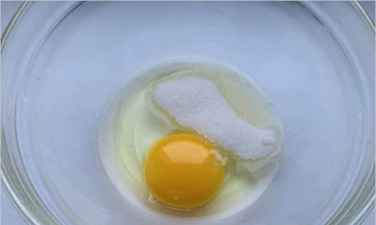 Шаг 2. Не теряя времени, в миску разбиваем яйцо и всыпаем сахар.