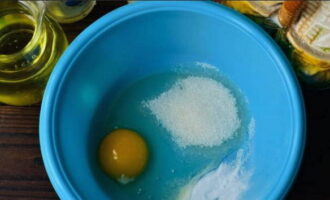 Как приготовить пышные панкейки на кефире? В глубокую емкость разбиваем яйцо и всыпаем сахар и соду.