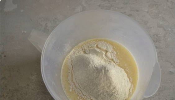 Объединяем сухую смесь с яично-молочной массой и взбалтываем при помощи миксера.