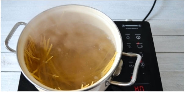 Шаг 8. Подсолив кипяток, кладем макаронные изделия.