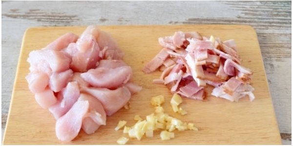 Шаг 2. Бекон нарезаем тонкими ломтиками. Мелко рубим чесночные дольки. Куриное филе режем так, как удобно.