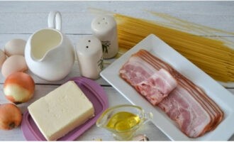 Классическая паста карбонара легко готовится в домашних условиях. Подготавливаем продукты.