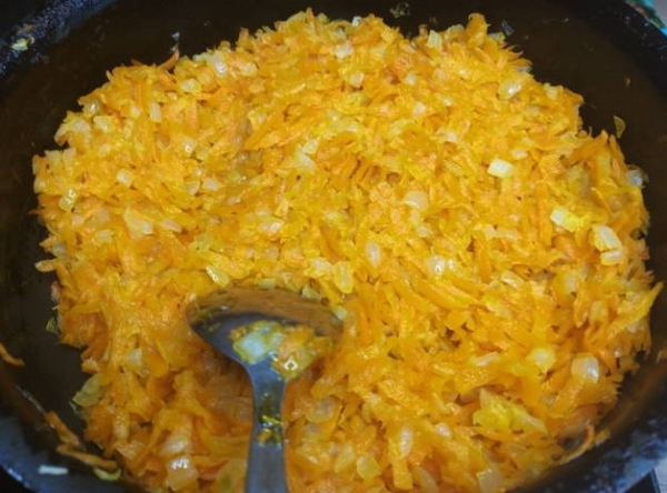 Шаг 3. К луку отправляем тертую морковь и жарим все вместе до готовности. Отдельно для заправки перемешиваем майонез, сметану, кетчуп и измельченный чеснок.