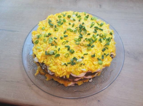 Торт из говяжьей печени с луком, морковью и майонезом