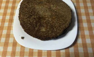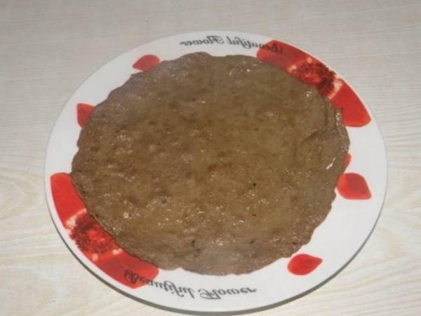 Раскаляем сковороду с растительным маслом и частями вливаем сюда массу из печени. Передаем ей форму блина и жарим до корочки с одной стороны.