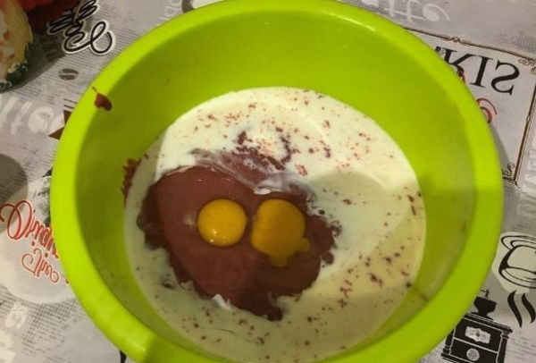Хорошенько вымешиваем наше печеночное тесто. Оно должно выйти жидковатым.