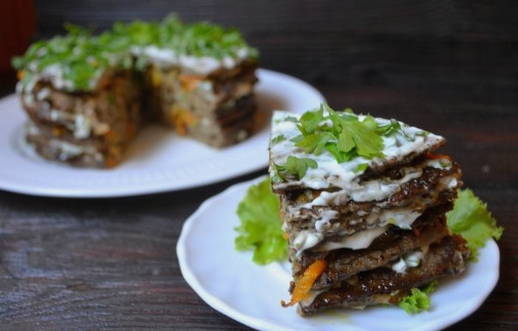 Печеночный торт из говяжьей печени с морковью и луком