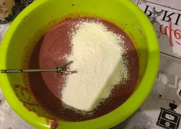 Шаг 7. Сюда же просеиваем необходимое количество муки и перемешиваем до исчезновения сухих комочков от мучного продукта.