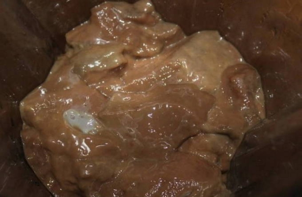 2. Затем печень измельчите в блендере или кухонном комбайне на самой высокой скорости.