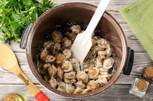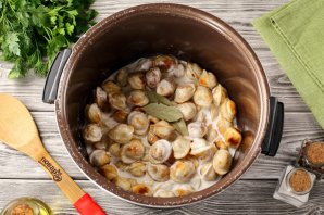 Влейте воду или бульон, аккуратно перемешайте, добавьте лавровый лист, закройте крышку и готовьте пельмени в сметане в мультиварке на режиме "Тушение" около 15 минут.