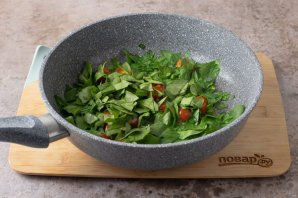 Шпинат помойте, обсушите и удалите длинные хвостики. Крупно порежьте его и добавьте в сковороду. Потомите шпинат примерно 30-40 секунд.