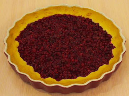 Шаг 7. На основу песочного теста выкладываем бруснику. Отправляем заготовку в разогретую до 180° духовку на 35-40 минут.