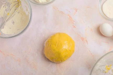 Шаг 4. Разбиваем сюда одно яйцо и всыпаем муку. Замешиваем плотное тесто, оборачиваем его пленкой и оставляем в холодильнике на 15 минут.