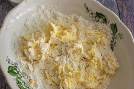 Шаг 1. В глубокой миске соединяем масло с сахаром, ванилином, солью, разрыхлителем и мукой. Вымешиваем до получения мелкой крошки.