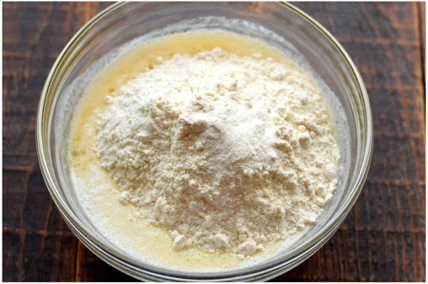 Шаг 2. Просеиваем сюда муку с разрыхлителем, вымешиваем до однородности и даем заготовке отдохнуть 15 минут.