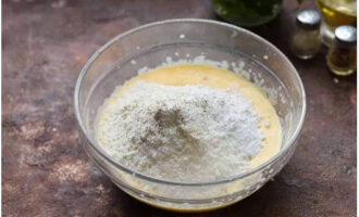 Шаг 2. Высыпаем сюда муку с разрыхлителем. Перемешиваем.