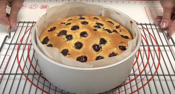 Для того, чтобы пирог не подгорел, накрываем его пергаментов за 10 минут до окончания выпекания.