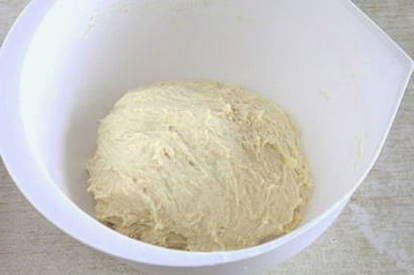 Шаг 3. К поднявшейся опаре досыпаем оставшуюся муку и замешиваем тесто, пока оно не перестанет липнуть к рукам. Накрыв, даем подняться.