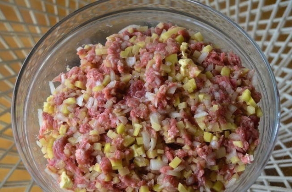 Шаг 2. Фарш приправляем специями и пряностями по своему усмотрению и вливаем немного воды для сочности. Вымешиваем начинку и слегка отбиваем.