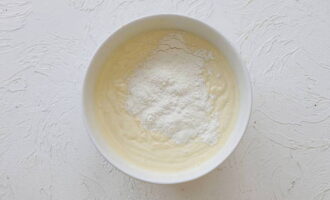 Шаг 4. Размешав, высыпаем просеянную муку с разрыхлителем.