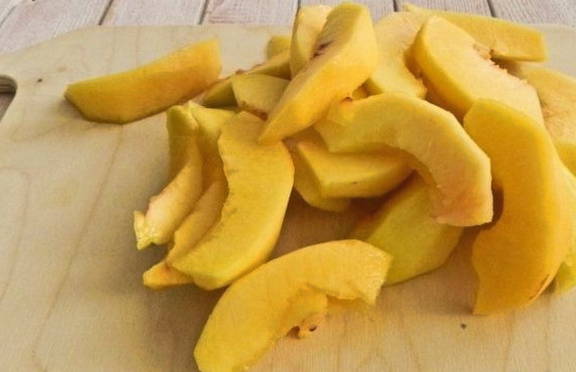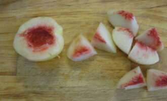 Шаг 7. С персиков сливаем жидкость. Даем им обсохнуть. Их разделываем тонкими дольками.