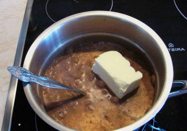 Шаг 4. В горячую массу забрасываем сливочное масло и мешаем до тех пор, пока компонент не объединится со всеми ингредиентами.