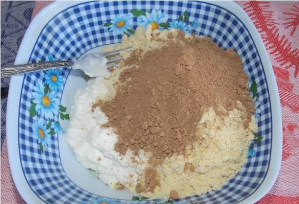 Шаг 4. К творожной массе отправляем какао (1 ст.л.) и песочную крошку, хорошенько перемешиваем.