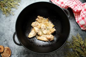 Мясо нутрии сполосните, обсушите и порежьте на кусочки, посолите и посыпьте специями, перемешайте. В казан выложите сливочное масло и налейте растительное. Разогрейте масло на среднем огне и обжарьте нутрию со всех сторон.