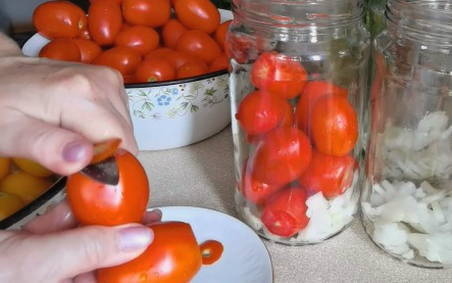 Шаг 4. В стерилизованные банки укладываем небольшой слой помидор.